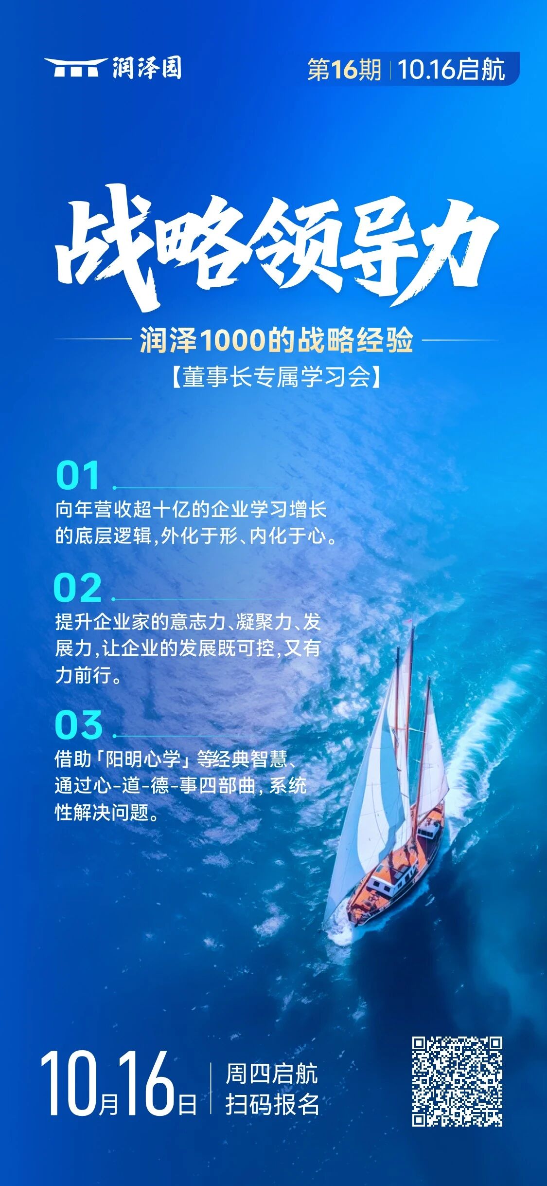 除此之外,10月16日,润泽园教育还将举办第16期战略领导力学习会。本次学习会的主题是:润泽1000(年营收十亿以上/员工千人以上)企业家的战略经验。